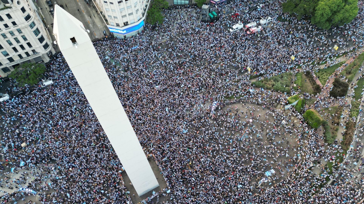 Allí, fue lo mismo de siempre, pero potenciado. Una enorme cantidad de gente se congregó rápidamente en la Plaza de la República, con camisetas celestes y blancas. Tal fue la movilización espontánea que la marea desbordó el lugar y ocupó una gran parte de la Avenida 9 de Julio y sus calles aledañas.