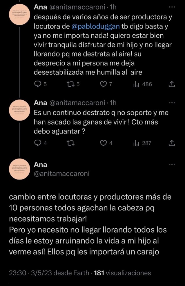 Maccaroni eligió Twitter para exponer los constantes malos tratos de Duggan en el estudio de Radio 10, donde hace tiempo trabajan juntos. Con un largo hilo de tuits escritos desde la bronca acumulada, la locutora detalló diversas situaciones y aclaró que esta no es la primera vez que sufre algo así.