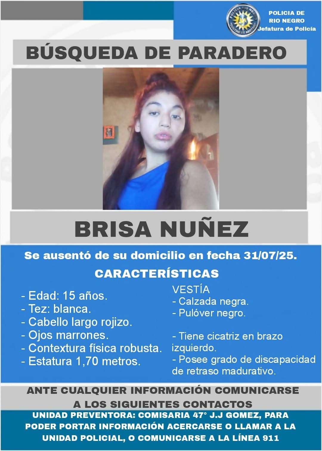 La policía rionegrina activó un operativo en la ciudad de General Roca para dar con el paradero de Brisa Núñez, una adolescente de 15 años que padece retraso madurativo, y que se había se ausentado de su hogar el 31 de julio.