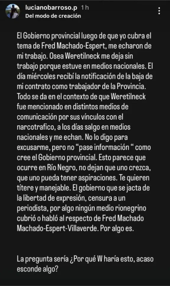 Luciano Barroso, reconocido periodista de la región que colabora con medios nacionales, denunció que fue despedido sin motivos del Instituto Provincial para la Administración Pública (IPAP) donde cumplía funciones desde 2021 Asegura que su desvinculación tiene que ver con la exposición de los vínculos entre Fred Machado y el gobernador Weretilneck…