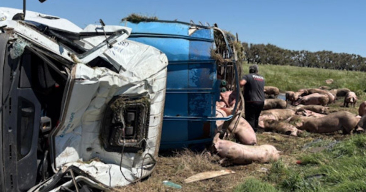 Un camión jaula que transportaba cerdos volcó en la Ruta Nacional 7 a la altura de la localidad bonaerense de Ingeniero Silveyra y, en cuanto se enteraron de la noticia, los vecinos de la zona se acercaron para llevarse a los animales, ya sea vivos o muertos.