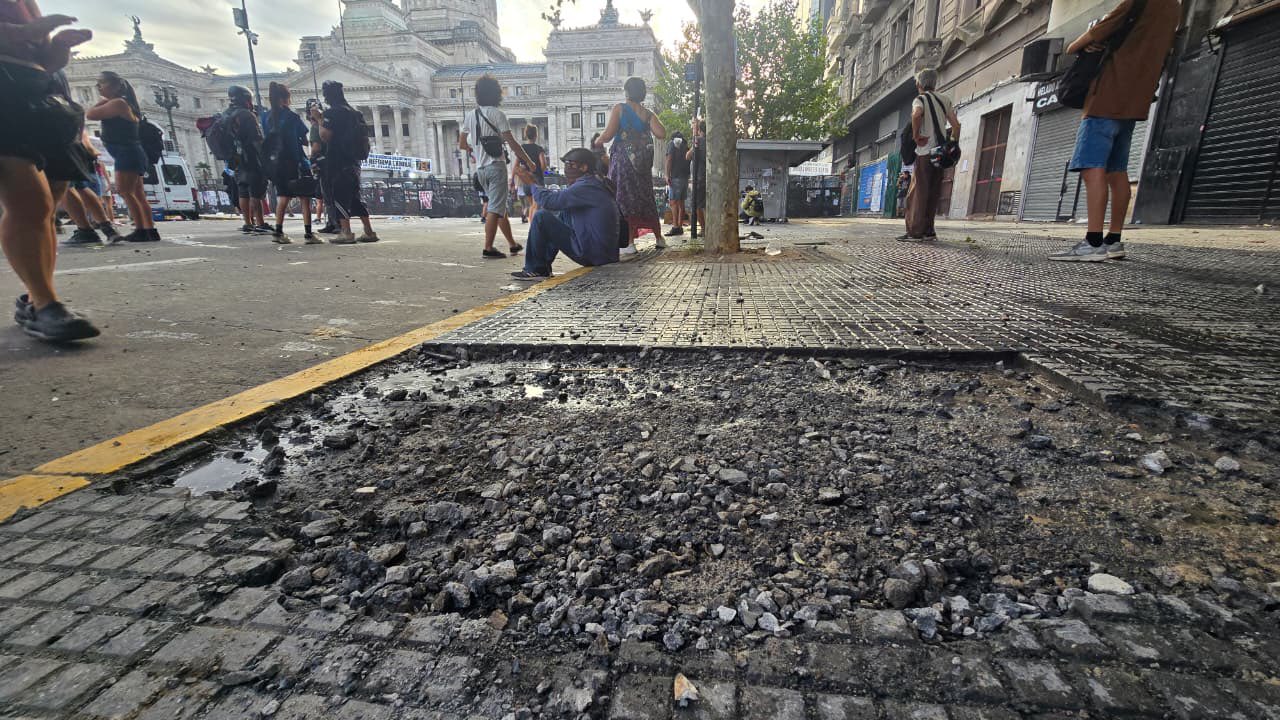 A su vez, otro grupo -con una maza y un martillo- comenzó a romper una vereda para empezar a lanzar piedras, una imagen similar a la que se vivió durante la votación de la reforma previsional en diciembre de 2017, durante la Presidencia de Mauricio Macri.