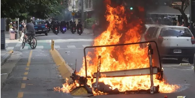 Si bien las fuerzas de seguridad no respondieron al principio, la situación escaló a medida que pasaban los minutos. Parapetados detrás de improvisados escudos de madera en plena Avenida Rivadavia, algunos manifestantes arrojaron bombas molotov y generaron focos de incendio en sectores próximos a las fuerzas de seguridad.