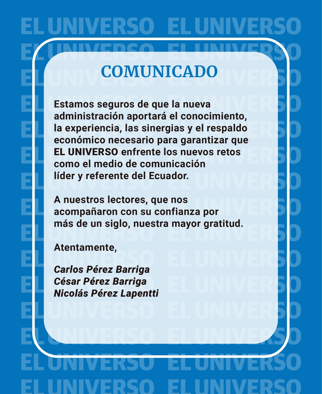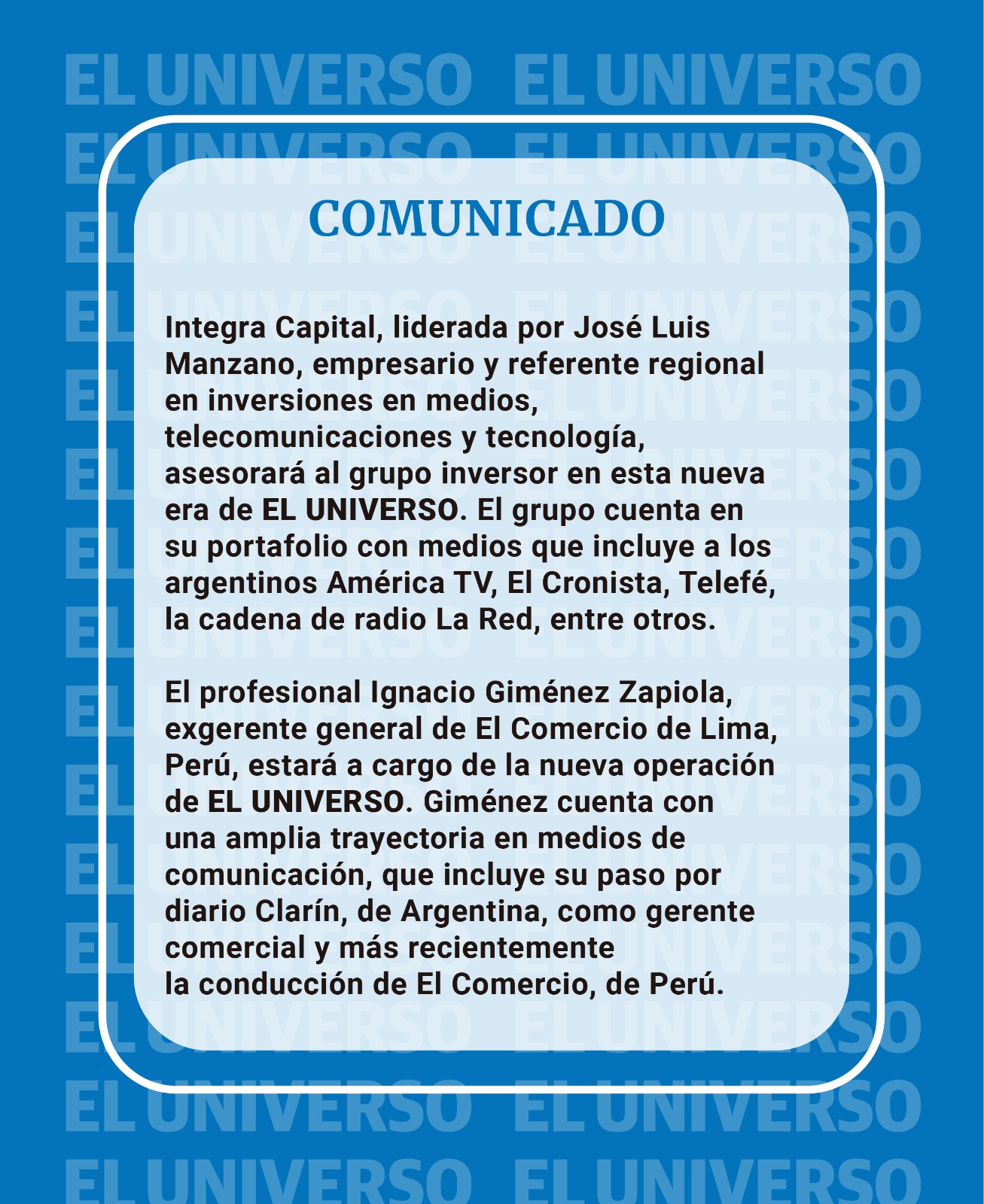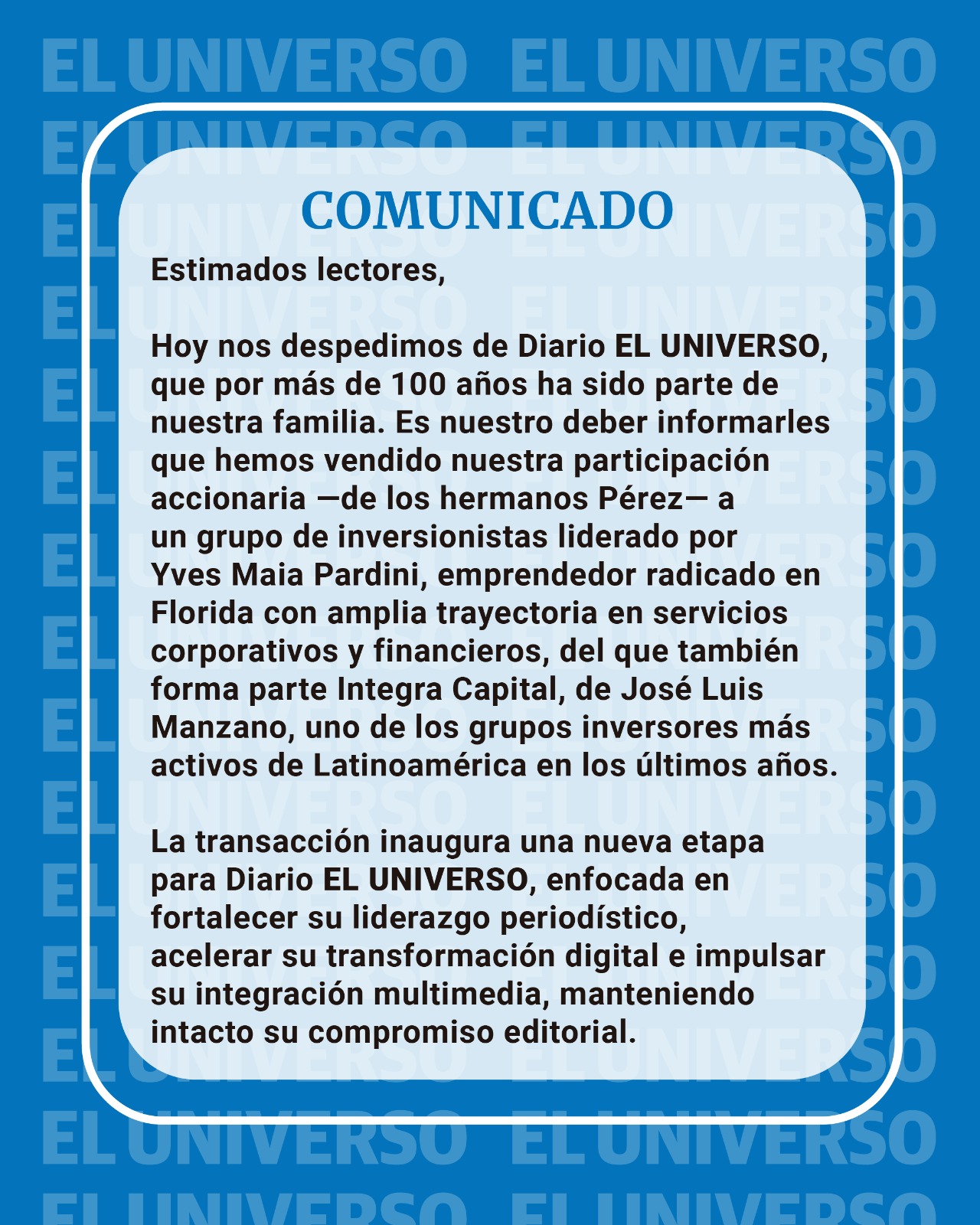 Según informó el propio periódico en un comunicado dirigido a sus lectores, la familia Pérez —históricos accionistas del diario— vendió su participación a un grupo de inversores liderado por el empresario Yves Maia Pardini y asesorado por Integra Capital, el fondo encabezado por Manzano. La transacción pone fin a más de un siglo de control familiar del medio fundado en 1921 y con sede en la ciudad de Guayaquil, y abre una nueva etapa en la historia del tradicional periódico ecuatoriano.