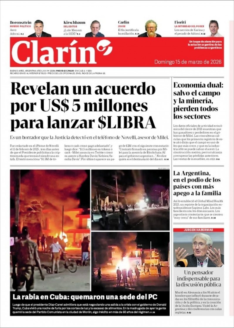 Javier Milei se sacó con la dura tapa del diario Clarín de este domingo que llevó como título principal la aparición de un documento extraído del celular de Mauricio Novelli que detalla un acuerdo con el presidente y su hermana para que a cambio de cinco millones de dólares promocionen la cripto $Libra.